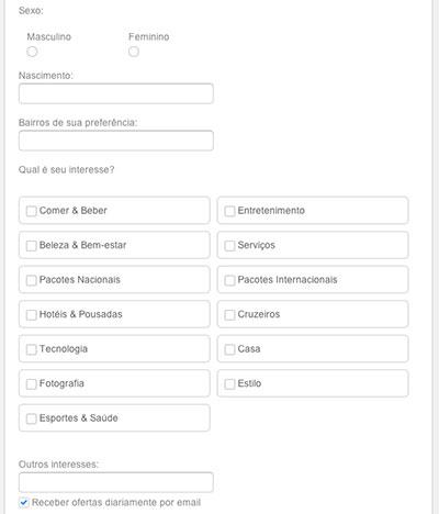 - Qual é o seu interesse: marque os seus interesses listados no site (comer & beber, beleza & bem-estar, pacotes nacionais, hotéis & pousadas, tecnologia, fotografia, esportes & saúde, entretenimento, serviços, pacotes internacionais, cruzeiros, casa e estilo).